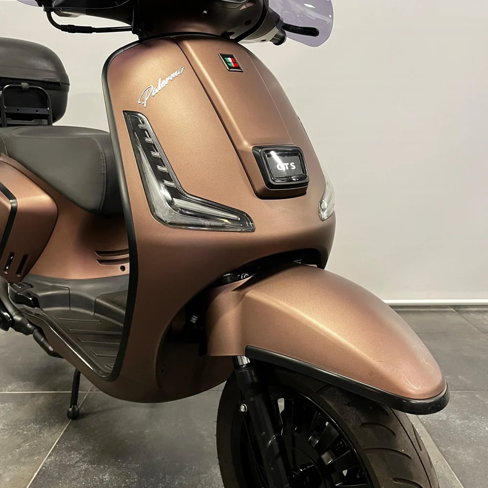 De mat bruine lak in combinatie met mat zwarte details geeft de Palermo een rustige, luxe uitstraling. Deze scooter is bovendien extra praktisch uitgevoerd met een hoog smoke windscherm, een opklapbare achterdrager en een grote topkoffer, ideaal voor het opbergen van een helm of boodschappen.