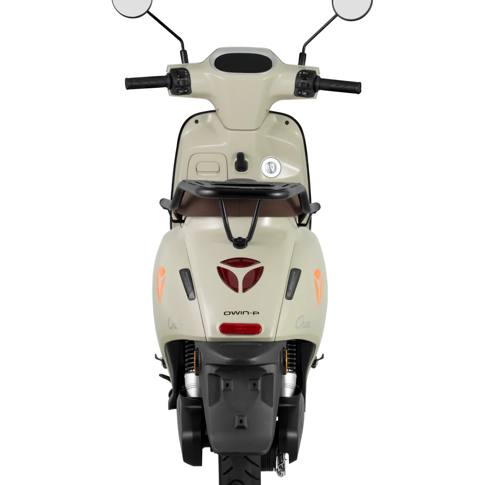De Owin rolt op 12-inch wielen (90/80-12) voor stabiliteit over klinkers en drempels. Je remt zeker met schijfrem voor en trommelrem achter. Het uitgebalanceerde chassis (ca. 72 kg) en het comfortabele zadel maken dagelijkse kilometers moeiteloos.